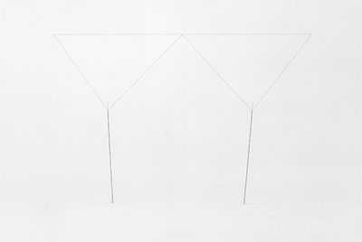 Jong Oh's artistic practice is quite particular since he does not use a studio but creates minimal sculptures in situ that respond to a given spatial situation. Responding to the nuanced configuration of each site, the artist constructs spatial structures by suspending and interconnecting a limited selection of materials: rope, chains, fishing wire, perspex, wooden and metal rods and painted threads. The elements of the work seem to float, and depending on the spatial relationship of the viewer with it these elements are connected and cross each other or appear as absolutely independent, suggesting additional dimensions to the simple three-dimensional space. Sometimes the threads that suspend these elements are practically invisible and sometimes the artist paints the thread lightly, reinforcing the visual presence of the element. Jong also uses lighting to create his compositions, where real shadows or painted lines by the artist in graphite extend his ethereal structures and favor the effect of optical illusion in a dialogue of lines and planes. His practice defies the traditionally expected assumption in sculpture of dense masses and heavy objects, acting like simple yet complex drawings that point out the particularities of the space they inhabit.