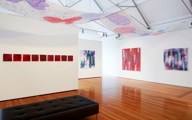 Her Nocturn body of paintings with their cryptic intricate calligraphy and veiled overlays perpetuates her ongoing focus on cultural and family connections and memories, on spiritualism and the continuum of life.