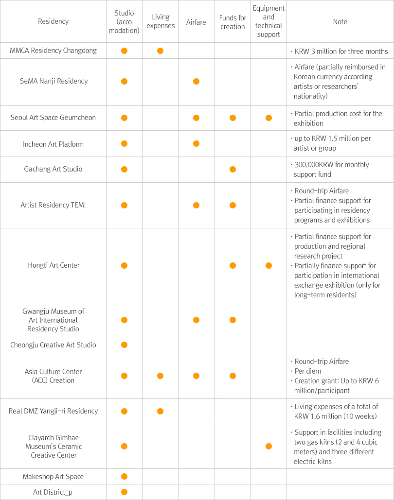 MMCA Residency Changdong & Goyang, Gyeonggi Creation Center, Incheon Art Platform, Seoul Art Space Geumcheon, Seoul Art Space Yeonhui, Seoul Dance Center, and SeMA Nanji Residency. (Note that since 2016, the Gyeonggi Creation Center no longer selects international artists through its contest.)