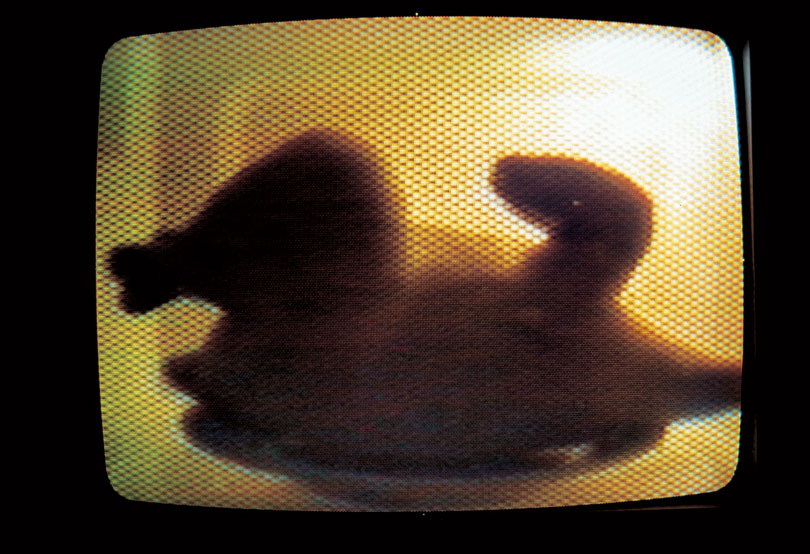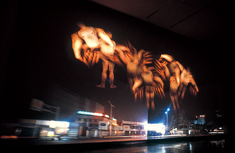 To consider installation works first, examples such as Nah Junki’s 〈Rendez-Vous〉 (1992), Ahn Soo-Jin’s 〈Feedback〉 (1999), Moon Joo’s 〈Sea of Time〉 (1999), or Oliver Griem’s 〈Pundang Loop〉 (1997) use devices to control encounters between image and reality, thereby substantially broadening the possibilities of video art. Installation works that structured reality and imaginary within a new perceptual framework—as attempted earlier by Park Hyun-ki—were achieved through different devices and installations. Pieces such as Kim Hae-min’s 〈TV Hammer〉 (1992) or Yook Tae-jin’s 〈Ghost Furniture〉 (1995) could be characterized as adopting the same kind of framework as the aforementioned examples while also inventing new media with their mechanized interoperation; their individuality and expressive independence as media art are accordingly robust. Another form involves the redesign or reassembly of media devices for appropriation as new image apparatus, although examples of this were not commonly seen in Korea through the 1990s. For example, Kong Sung-hun’s 〈The Fall〉 (1996) was produced with 12 slide projectors made by the artist himself; while multi-side projection technology has been so thoroughly marginalized within the history of visual media development that it could well be approached today within the field of “media archaeology,” the artist made outstanding use of it at the time to produce distinctive work. Kim Young Jin’s 〈Fluids: A Transparent Shadow of Loss〉 (1995–2008) is a real-time projection using a projector devised by the artist based on ongoing research; in addition to being a superior example of a device, it also exhibits outstanding artistic mise-en-scène capabilities.