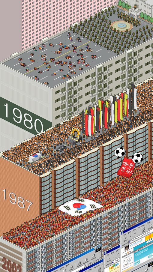 Sunwoo Hoon offers compressed data in vertically and horizontally continual images, building political and social narrative that flows by scrolling down. This is a common feature found in the artist’s other occupational background as a webtoon artist (debuted with webtoon). is a piece that transforms the building rooftops with each year written into the spaces of Gwangju Uprising, June Struggle, and the 2002 World Cup.