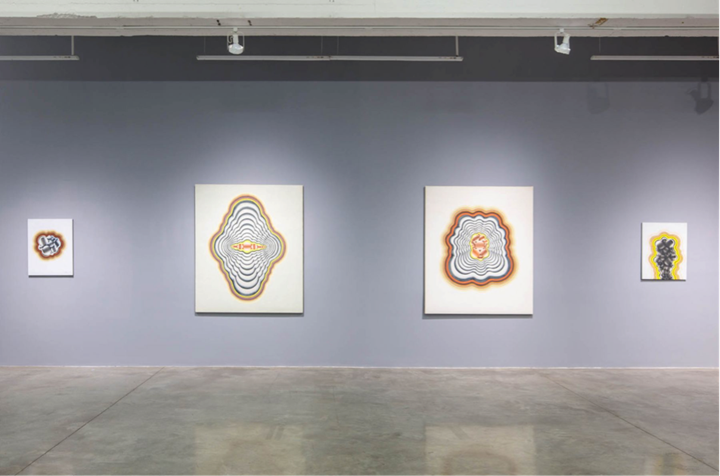 The exhibition opens with a group of works created soon after this juncture in Kim's life. It comprises paintings wherein oozing forms protrude from various geometric configurations, and undulating lines wrap around nuclei of gradient circles. These compositions allude to the visual vocabularies of Minimalism and Op Art—most tellingly in the way that sparse backgrounds give way to swelling, ambiguous shapes; Kim fittingly referred to the canvases as 'paintings of the intestines', in light of their apparent biomorphism. The rippling of black and white lines also calls to mind Op Art's play on ocular perception, acting as a precursor to the illusionist depictions of water drops that would define Kim's practice for over four decades to come.