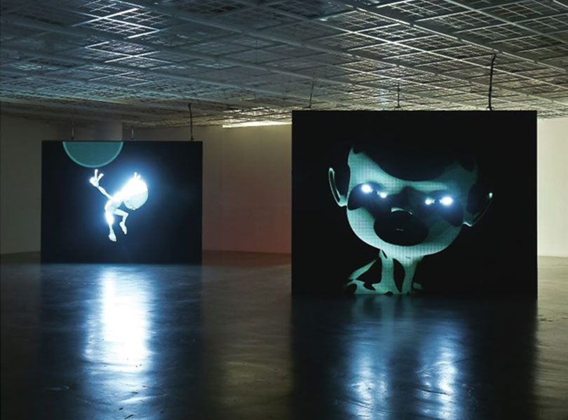 MYSTERIOUSS (left) / CURIOUSSSA (right), 3D Animation, Black & White (each 3 min / 2mins 31sec), Installation view at Art Sonje Center, 2017. Koo uses the animation medium to present two aspects, mystery and curiosity, of the “ousss” keyword she has used in her work since 1998. In 2007, she worked with the writer Edouard Glissant to publish a work interpreting the nature of “ousss” through special characters.