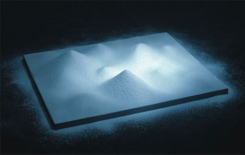 Oslo, Crushed aspirin, wood and blue light, 1998.0. Koo Jeong A grinds aspirin into a fine powder and slowly pours it onto a low cuboidal platform. Layered like the texture of time, the fine powder becomes mountains, hills, a snowy field under the blue lights. With this powder, produced by grinding down dust and rock that have been gathered over time, she poses a fundamental question about mountains. Yet the mountain does not vaunt its presence. A massive chandelier, created for the exhibition by the artist and a local artisan, is installed on the floor of the sealed space; hundreds of candles are lit. Throughout the exhibition, the candles emanate scents of smoked wood and mushroom. Wax drippings flow down and form layers on the floor, the spreading soot in the art permeating the ceiling, walls, and ground. We need to hear it with our eyes, smell it with our ears, see it with our nose. Everything is unclear.