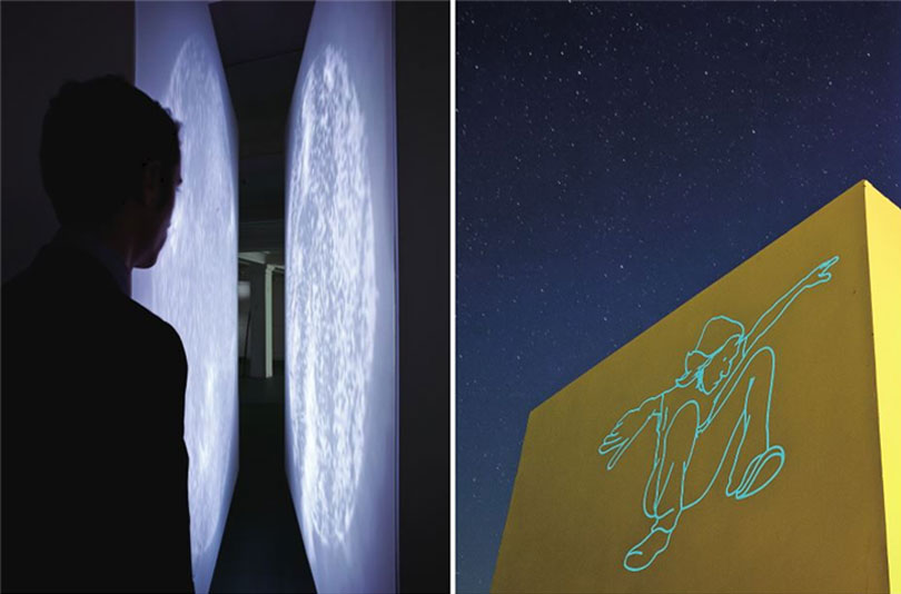 Left) OUSSS SISTER, Drywall, Nylon, Double Video Projections, Mute, Black & White, 5min 9sec(loop), Installation view 'Constellation Congress' at Dia Art Foundation, 2010. / Close-up images of storms on the Sun’s surface are replayed atop two nylon cubes. The viewer experiences the visual sensation of approaching the Sun from a narrow aisle between the cubes, along with the heat given off by the projector.0. We still have no way of knowing what exactly “ousss” is, but it is the name for world that is the same yet other, differing in time and space like a parallel universe. It is also a story of the future and something tied to dreams. It interests us because the future and dreams never do come to pass, nor could they ever. It is not merely a matter of wordplay—and what if it were? In the artist’s self-made dictionary Flammariousss, “ousss” is defined as follows.