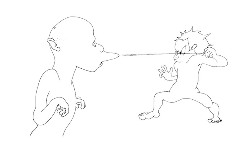 Ki In Sang Bong, Drawing on paper, 84x169cm, 2012. / This drawing shows the encounter between two eccentric characters in unusual poses. The characters in Koo’s drawings change location from one work to the next, serving as protagonists in abstract narrative. The artist also produces architectural drawings for site-specific installations.