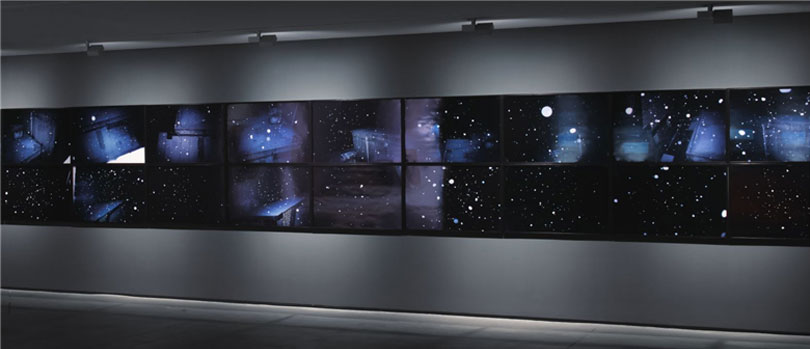 U Becomes Snow, Digital print, 20 Pieces, 57.6 x 90cm (each), 1998. / The artist spent a midwinter night walking along the stairs of an apartment photographing snowflakes in the night sky. With the snowflakes appearing comparatively huge next to the tiny urban buildings, the photograph encourages us to adopt a unique perspective on ordinary snow.