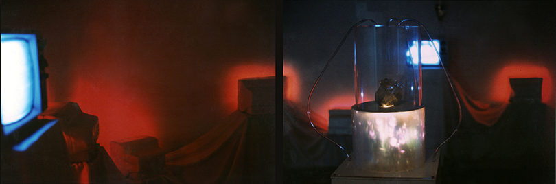 Park continued her evolution as a video artist the following year with her graduation piece, 〈PULSE ROOM〉 (1994). Although closer to a conventional video work than Incubator, 〈PULSE ROOM〉 still incorporated elements of the surrounding space, such that it should be considered as a “video scape.” In the primary video, a foaming mouth recited the phrase “Be still my beating heart” before disintegrating into static. Another video showed a quivering blue line, reminiscent of a heart monitor just before the patient flat-lines. In accordance with the title, the room where the videos and light-reflecting castings were shown had a distinct “pulse,” from the installation of TV monitors and monitor-shaped sculpture that flickered at various speeds and reflected light. According to Park, the work was partially inspired by her experience studying abroad, when she realized that the flickering light of the TV reflected on the wall of her room felt like a pulsating being.11 Such environment inevitably coaxes contemplations of the paradoxical mixture of frailty and tenacity in living beings, our inherent feelings of isolation, and the contrast between warm, organic life and cold, inhumane medical systems.