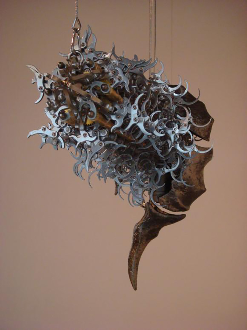 Choe Uram's mechanical creatures are slow and flexible in their movements. Their motion is ill-suited to survival; any animal moving at that pace is certain to be snapped up by a predator. Certainly, it hurts one's chances of surviving in the jungle of capitalism, where the principles of survival of the fittest and the strong dominating the weak operate explicitly. But no predators, no conflict, are to be found in the ecosystem that Choe has constructed. Many works of science fiction show a kind of proxy warfare, echoing real-world conflicts in jaw-dropping displays of carnage and destruction. There is no war in Choe's world. But the creatures in it, by reflecting our world, are faithful to the mission of art: using metaphor and imagery to express what cannot readily be understood. Opertus Lunula Umbra, which was shown at the 2008 Liverpool Biennial, is a behemoth of a piece, weighing in at 750 kilograms and stretching to fully 5.70 meters in length. Shaped like the crescent of a new moon, it swam through the venue with leisurely movements of its oarlike ribs. "On brightly moonlit nights, I would sit up watching the sea on the docks of Liverpool and it was as though some organism was rising up over the surface of the water," Choe says. "With this work, I was recreating those sunken boats and machines in the waters off Liverpool." The name of the piece means "hidden moon shadow." By giving classical, lyrical names to his cold, mechanical beings, Choe is trying to build a new myth where myth has been lost to civilization.