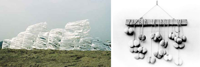 WIND – FOLK AMUSEMENT, 1971, performance with cloth, fabric: 1 x 80 m. On an overcast, windy afternoon in the fall of 1971, Lee Seung-taek and a group of friends ventured out onto Nanji Island on the Han River in Seoul, and unfurled three giant strips of scarlet cloth. With one person holding each end, the cloths rose with the wind, gradually unraveling to their full 80-meter lengths—three enormous red arcs, billowing, swaying and whipping in the sky. Wind – Folk Amusement is one of many large-scale outdoor works in which Lee gives form to the transience of nature.