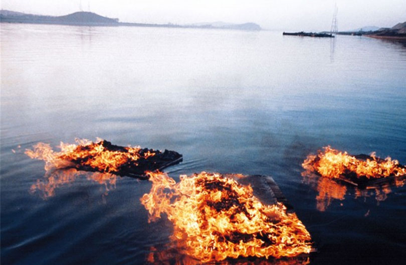 BURNING CANVASES FLOATING ON THE RIVER, 1964, installation on the Han River in Seoul. In an early work that signifies a literal rejection of convention, entitled Burning Canvases Floating on the River (1964), Lee took three figurative paintings of the kind that represented the stolid old-guard of Korean modern art, set them alight and cast them adrift in the Han River at dusk. Lee has repeatedly made works along the Han, as it represents a fundamental bond between North and South Korea. By the same token, however, the South Korean military keeps the river under close surveillance as it is an easy route of infiltration. Lee explains that he was only able to execute Burning Canvases on Christmas Day, when security in the capital was relatively relaxed. As soon as he had set the canvases on the water and photographed them, he left the scene. How long the canvases floated there and whether or not anybody saw them remains unknown.