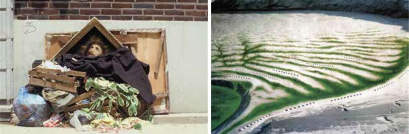 Left) AT LAST, ART HAS BEEN GARBAGE, 1973, mixed-media installation featuring a painting of Jesus Christ in a pile of trash.Outdoor pieces such as these exemplify Lee’s idea of “non-sculpture,” and yet he does not reject craftsmanship. His body of work includes solid sculptures of his own making, as well as assemblages composed of found objects. Lee’s art-making is spontaneous to the point of incoherence; there are few obvious sequential developments in his style. He develops his ideas on a whim, sometimes coming back to them many years later and reworking them in a different context. One example is At Last, Art Has Been Garbage (1973), made when he discovered an abandoned painting of Jesus Christ in the street. Intrigued by the casual iconoclasm of discarding a painting of Jesus, as well as the phonetic similarity between the Korean words for Jesus (yesu) and art (yesul), Lee made an installation in which the painting stuck out from a pile of trash.