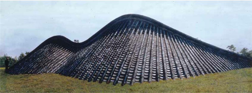 Left) The artist staging an “Earth Performance” in the Sculpture Park at Suwon World Cup Stadium, 2002.Though Lee has operated outside of the mainstream of the Korean art world, over the past few decades he has gradually gained enough recognition from a handful of open-minded artists and critics to win him some commissions for his contemporary work. For the Seoul Olympics in 1988, he was asked to make a piece for the city’s Olympic Sculpture Park. Rising out of the ground, Tile Works is a nine-meter-tall and thirty-meter-long undulating roof of ceramic tiles, its form suggesting that some kind of distorted temple has been half-buried in the earth—a contemporary artwork that draws on the tension it creates between its reference to Korean architectural heritage, its warped but elegant shape and the sheer irrational incongruity of its emergence out of the ground. “I take inspiration from Korean heritage,” he says, “because things that are the most ethnically specific and local are also the most international.”