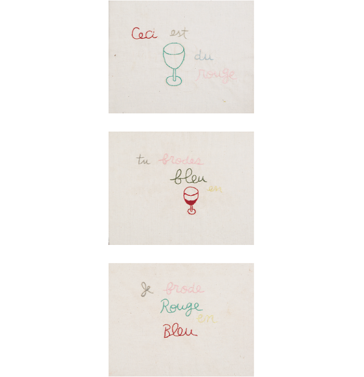〈This is a glass of red〉, 1979, Stitches on fabric, 26.5x32.5cm. 〈You embroider blue in red〉, 1979, Stiches on fabric, 26.5x32.5cm. 〈I embroider red in blue〉, 1979, Stitches on fabric, 26.5x32.5cm. Image Courtesy of the Artist