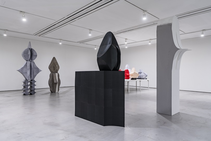 Hwang has been taking time to carefully examine and understand the materials she chose, developing her works through a labor-intensive production process. Her interest in the materials and inquisitive attitude imbues on these works a unique personality, and by throwing away the existing characteristics of the materials, the exceptional forms of her sculptures arise.For example, Harder (2014-16), light aluminum foil is massed together and hammered into a hard lump, and in Heavier (2016), scattered sand is bonded together and forged into a heavy form. In 〈Paper Body, Paper Face〉, Hwang selects ‘paper’ as her material and probes both its characteristics and her own practice with it in her works. Following the organic lines made by a French Curve, an instrument for measuring garments, she folds, cuts, and glues the paper over and over again to create a naturally abstracted form.