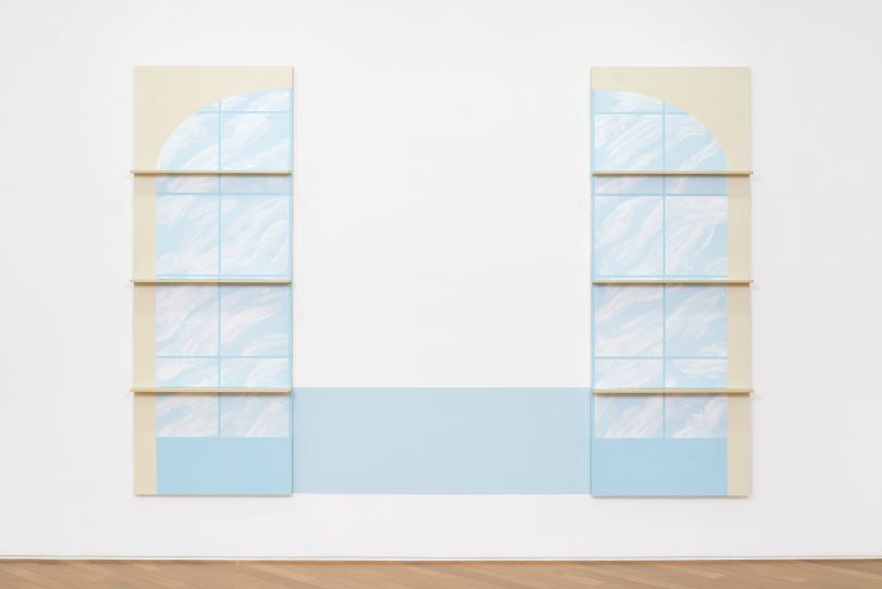 〈Sky blue : layered landscape〉, 2021, acrylic on birch plywood, wall painting, each 190x70cm, dimensions variable. courtesy of the artist.
