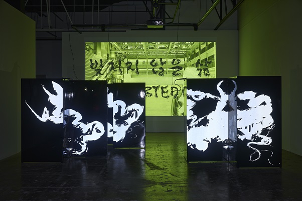 Folding screen structures, a single-channel video, and the visitor’s actions compose one work. Several black panels are installed, and small..