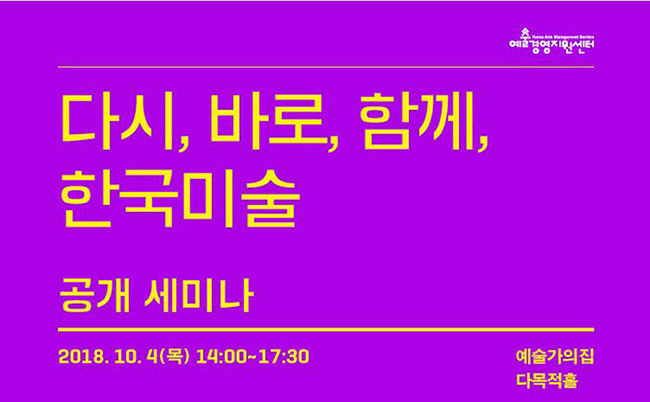 (재)예술경영지원센터(대표 김도일, 이하 예경)에서 주최‧주관하는 <다시, 바로, 함께, 한국미술>은 한국 현대미술 세미나이다. 한국 현대미술의 거대담론과 미시담론 사이에서 종적‧횡적 검토와 연구, 토론을 위해 기획되었다. 전후부터 동시대까지 세 시기로 구성된 연구팀은 각각의 연구방향을 설정해 각 시기에 대한 다양한 시각을 종합하고 객관적으로 검토하는 워크숍의 결과 보고형 세미나로 진행된다.