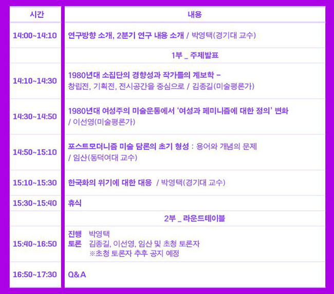 지난 8월 전후부터 1970년대까지의 ‘현대의 응시’와 1990년대 이후에 대한 ‘전시는 말할 수 있는가?’로 두차례 세미나가 진행된 바 있다. 이번의 ‘운동으로서의 미술 : 1980년대’ 는 태풍으로 인해 취소된 세미나를 가을에 재개최하는 것. 서울 대학로의 예술가의 집에서 아래의 링크를 통해 참가 신청 할 수 있다.