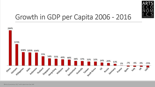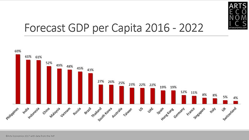 이런 현상을 몰고 온 이유 중 가장 큰 부분은 아무래도 부의 성장입니다. 지난 10년간 1인당 GDP의 성장 중 세 자리 수의 성장을 보여주는 것은 중국(284%)과 베트남(173%), 필리핀(108%), 인도(105%) 등 중국의 경제와 관련 있는 국가들입니다. 여기에 일본은 없어요. 일본을 이 국가들과 같이 볼 수가 없는 이유는 경제가 이미 성숙 단계에 들어선지 오래되었기 때문입니다. 지난 10년간 GDP의 성장률은 꾸준히 평균 약 9퍼센트를 보여 주고 있습니다. 하지만 중국, 필리핀, 인도네시아(104%),홍콩(55%) 등은 50퍼센트 이상의 GDP 성장률을 나타냅니다. G7국가들이 25퍼센트 내외인 것과 비교가 됩니다(독일 13%, 프랑스 1%,영국 -9%, 이탈리아 -9%, 미국 -9%). 안타깝게도 몇몇 국가는 심지어 연봉이 마이너스 성장세를 보입니다. 이런 현상들은 단순히 지난 10년간의 추이를 보여주는 것뿐만 아니라 향후 5년간 연봉이 급속히 증가할 거라는 것과 그런 현상이 계속되리라는 것을 예측하기도 합니다. 더 흥미로운 것은 1990년대의 미국의 평균 연봉은 중국의 자그마치 70배였어요. 2006년에는 20배가 되죠. 지금은 7배 수준으로 점차 그 격차가 줄어들고 있습니다. 하지만 중국이나 아시아의 다른 국가들을 보면 여전히 미술 시장에 참여하는 인구의 비율이 현저히 적습니다. 결론적으로 연봉은 급격히 증가하고 있지만 아직 미술 시장의 참여율은 낮은 거죠. 이것은 향후 미래 시장의 발달에 긍정적인 신호이며 잠재적인 발달 가능성으로 여겨집니다. 이러한 자산의 원동력은 앞으로 미술시장이 어떻게 발달하느냐에 매우 긍정적으로 작용할 것입니다.