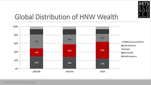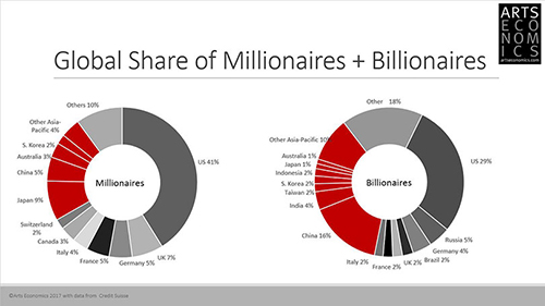 미술 시장에 있어서 또 다른 결정적인 요소는 지금 현재 고액순자산보유자(High Net Worth Individuals)들, 말하자면 백만장자, 억만장자들이 미술 시장에 투자하는 금액 때문에 전체 자료가 왜곡되어 나타난다는 점입니다. 수치들을 분석해 보니 이런 소수 사람들의 행동이 시장에 큰 영향을 미치고 있다는 점을 발견했습니다. 이런 점에서 미국은 여전히 가장 많은 백만장자들이 살고 있는 국가이죠(미국 41%,일본 9%, 영국 7%, 중국·독일·프랑스 5%). 세계 백만장자의 인구비율을 보시면 아시아는 23퍼센트를 차지하고 있어요(일본 9%, 중국5%, 오스트레일리아 3%, 한국 2%, 기타 아시아 4%). 억만장자의 수를 보면 그 비율이 더 큽니다. 아시아 기반 억만장자의 비율이 40퍼센트에 달해요(중국 16%, 인도 4%, 타이완 2%, 한국 2%, 인도네시아 2%, 일본1%, 오스트레일리아 1%, 기타 아시아 10%). UBS가 작성한 억만장자에 관한 보고서에 의하면 현재 아시아에서는 사흘마다 신흥 억만장자가 만들어진다니 정말 경이로운 현상이 아닐 수 없죠.
