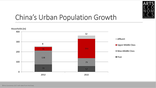 다음의 수치는 단순히 인구 비율이 아니라 그들의 자산 규모를 나타내고 있습니다. 고액순자산보유자들의 자산입니다(2001: 유럽33%, 아시아 태평양 지역 19%, 북아메리카 29% / 2015: 유럽 23%,아시아 태평양 지역 30%, 북아메리카 28% / 2025: 유럽 19%, 아시아태평양 지역 40%, 북아메리카 24%). 이건 좀 다른 의미의 정의예요. 이건 투자 가능한 자산이 100만 달러 이상인 경우를 보여줍니다. 하지만 이 표가 보여주는 건 말 그대로 이런 지표가 역동적으로 계속 변화한다는 것입니다. 지난해만 보더라도 아시아 태평양 지역의 자산이 북미의 자산보다 더 많았다는 것은 대단한 일이죠. 지난 15년간의 고액순자산보유자의 통계를 보면 아시아 태평양 지역의 자산이 급격히 증가하고 심지어 미국보다 많아지는 현상이 나타났는데, 역사상 처음 나타난 일이었기 때문에 굉장히 흥미롭더군요. 다음은 캡제미니(Capgemini)와 제가 매년 연구하고 있는 세계 자산에 관한 리포트에 따른 것인데 아시아에서는 중국과 일본이 고액 순자산 부분에서는 아직 가장 중심에 있습니다. 특히 일본은 고액순자산보유자의 인구비율 수치가 높고 중국과 일본 모두 전체 자산 보유 수치에서 중심적 위치를 차지하고 있습니다. 하지만 그 외에도 중요한 세계 컬렉터들을 양산하고 있는 국가들도 있습니다. 말씀드린 바와 같이 그 컬렉터들은 단순히 아시아 지역 안에서만 구매하는 것이 아니라 국경을 넘어 전 세계로부터 구매를 하고 있다는 점이 특징입니다. 단순히 현장 거래에 영향을 미칠 뿐 아니라 국제적으로 미치는 영향이 매우 크기 때문에 더욱 중요하게 여기고 있습니다. 조금 전에도 말씀드렸듯이 자산이 급격히 증가함에도 불구하고 여전히 현재는 미술 시장에서의 참여율이 낮다는 점도 아주 긍정적으로 생각합니다. 중국에서는 소수의 백만장자나 억만장자들이 미술품 구입에 아주 큰 역할을 하고 있지만 정작 중국과 같은 나라에서 필요한 것은 미국이나 영국처럼 중상위층이 중간 규모시장을 잘 지탱하는 것입니다. 하지만 이에 대한 예측 역시 긍정적입니다. 매켄지(Mckinsey) 자료에 의하면 2020년에는 중국의 도시 인구 증가율이 최고에 달할 것이고, 그 도시 인구 중 아시아에서 중상위층이 차지하는 비율이 가장 높을 것으로 예측됩니다(2012: 최상위층 800만, 중상위층 3,600만, 중산층 13,800만, 빈곤층 7,400만 / 2022: 최상위층 3,200만, 중상위층 19,300만, 중산층 7,900만, 빈곤층 5,700만). 이런 예측은 미술 시장에서 중요한 지표입니다. 그 이유는 지금 현재로서는 중상위층의 비율이 낮으며 특히 중국에서 그런 현상이 제일 뚜렷하기 때문입니다. 결국 현재 중국에서 나타나는 높은 구매율은 결국 극소수 인구의 구매 활동에 기인한 결과라는 것이죠. 이런 현상은 어떻게 보면 경매 회사나 미술품의 질적인 수준과도 관련이 있다고 볼 수 있습니다. 공급자에 비해 구매자가 충분히 많지 않은 경우도 그 원인 중의 하나이고요. 이것이 현재 일어나고 있는 매우 중요한 역학 관계입니다.