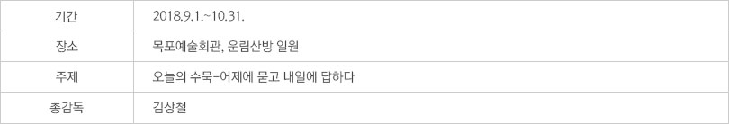 《전남국제수묵비엔날레》에는 예향남도의 위상을 회복해 ‘남도문예르네상스’의 선도사업으로 삼겠다는 전라남도의 포부가 담겨 있다. 특히 올해는 1018년 고려 현종 때 전주와 나주의 첫 글자를 따서 전라도라고 명명한 지 1천 년이 되는 해이다. 수묵의 역사와도 그 명맥을 함께하는 전라도는 대한민국 남종화의 화맥이 시작된 곳이자 수묵화의 전통을 곧게 이어가고 있는 고장이기도 하다. 그 중에서도 목포와 진도라는 지역적 특성은 전시와 전시 관람 환경에 개성을 더하고 있다. 목포는 자체적으로 암산과 바다를 곁에 두고 있어 다양한 산수와 식생을 관찰할 수 있는 곳이며, 전라남도 남단의 평야와 진도대교를 지나야 만날 수 있는 진도 역시 뭍과는 다른 산세와 풍광을 가지고 있다. 전남은 공재 윤두서(1668~1715), 소치 허련(1807~1892), 남농 허건(1907~1987) 등 수묵의 대가를 배출한 곳이며 김환기(1913~1974)와 오지호(1905~1982) 등 서양화 거장들의 자취가 남아 있는 곳이기도 하다. 목포를 지나 진도로 오는 첫 번째 관문인 울돌목은 충무공 이순신의 3대 해전 중 하나인 명량대첩지로 널리 알려져 있으며 전시가 열리고 있는 운림산방은 조선시대 남종화의 소치 허련이 말년에 거처하며 여생을 보냈던 곳으로 이후도 허씨 일가에 의해 사용됐던 곳이다.