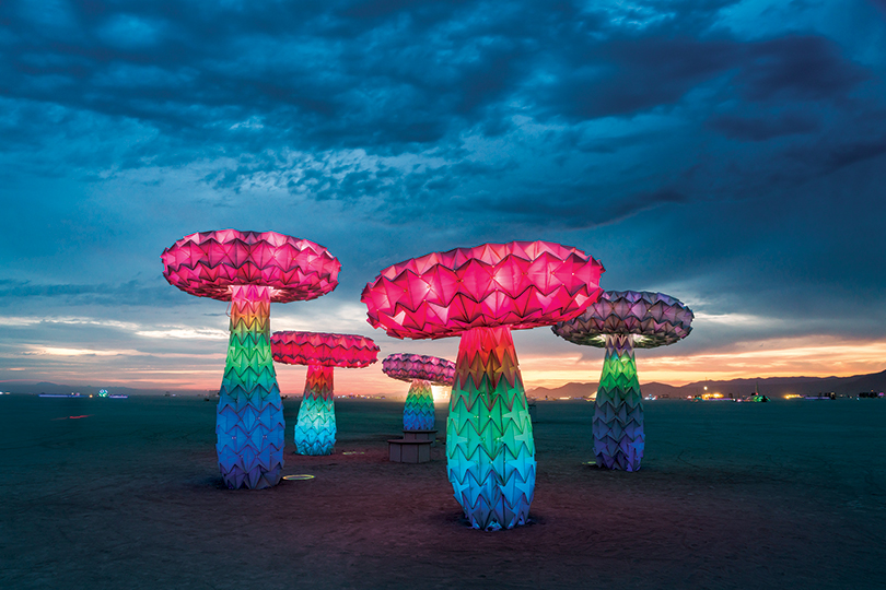최근의 공공미술 프로젝트에서는 인터랙티브한 작업의 인기가 높아지다 보니 점차 아트와 테크놀로지의 접점이 넓어지고 있다. 그 중에서도 기계 공학적 움직임을 부여한 키네틱 아트(Kinetic Art)가 눈에 띈다. 최근 ‘아트 바젤 홍콩(Art Basel Hong Kong)’ 기간 전시되었던 폴드하우스(FoldHaus)의 〈LUMENous GARDEN〉이 단연 돋보이는 키네틱 아트 프로젝트 중 하나이다. 이 작품은 홍콩의 대형 쇼핑센터이자 호텔이 있는 퍼시픽 팰리스(Pacific Place) 중앙 광장에서 올해 3월 18일부터 4월 14일까지 약 한 달여 간 전시되었다. 폴드하우스는 공동 예술가 그룹으로 능력과 열정이 있다면 기꺼이 누구나 참여해 작업을 함께할 수 있는 ‘메이커 문화(Maker culture)’에 그 뿌리를 두고 있다. 샌프란시스코 실리콘 밸리 지역에 기반을 두고 디자인회사 아이데오(IDEO)의 출신 직원들이 대부분인 이 콜렉티브는 수평적 구조로 함께 이끌어가면서 예술과 기술로 사람들을 하나로 잇는다는 기치를 갖고 다양한 실험을 이어가고 있다. 폴드하우스의 파운더 중 한 명인 외르크 스튜던트(Joerg Student)는 설치한 〈SHRUMEN LUMEN〉과 〈BLUMEN LUMEN〉을 두고 “다른 잡생각을 버리고 오로지 이 작품에 놀라워하는 마음으로 순간에 집중하게 만들고자 빛과 크기, 움직임을 이용해 사람들의 시선을 사로잡았다”면서 “쇼핑몰 내에 설치하게 되었기에 이 작품이 사람들을 쉴 수 있는 매개가 되고, 마치 꿈을 꾸는 듯한 느낌을 주고 싶었다.” 고 말했다. 이는 본래 네바다주 블랙 락 사막(Black Rock Desert)의 ‘버닝맨 페스티벌(Burning Man festival)’을 위한 설치 작품이었다. 사막의 특성상 황무지이고 아무것도 자랄 날 수 없는 환경이기에 그곳에 생명과 아름다움을 피워내고자 꽃봉오리와 버섯 형태를 거대하게 만들고 아주 천천히 움직이는 구조물을 만들었다. “작품과 서로 소통하며 놀면서 사람들이 어린아이 때 느끼던 기분을 경험하게 하고 싶었다.” 작업이 본래 야외 공간에 설치하도록 디자인된 것이기에 바람과 비에 강하고 땅에 잘 지지되면서도 작품 간에 전기가 서로 통하게 되어 있다. 이번 실내 설치의 경우는 인공 잔디와 나무, 강철로 만든 마운드가 전력과 데이타 라인을 가려주면서 작품을 지지하게 했다. 작업이 크고 형태가 복잡해 설치와 운송 작업이 꽤 까다로워 폴드하우스 팀 멤버들이 홍콩에 가서 직접 설치했다. 작품은 종이를 접고 펴면서 노는 방식의 오리가미(Origami)에서 영향을 받고, 식물의 이파리와 꽃 등에서 찾아볼 수 있는 아름다운 패턴들에서 영감을 얻었다.