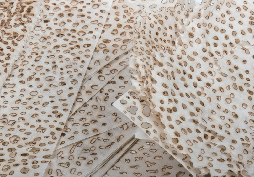 김민정은 촛불을 이용해 한지의 가장자리를 태우거나, 향으로 구멍을 뚫어 태운 흔적을 화면에 남긴다.