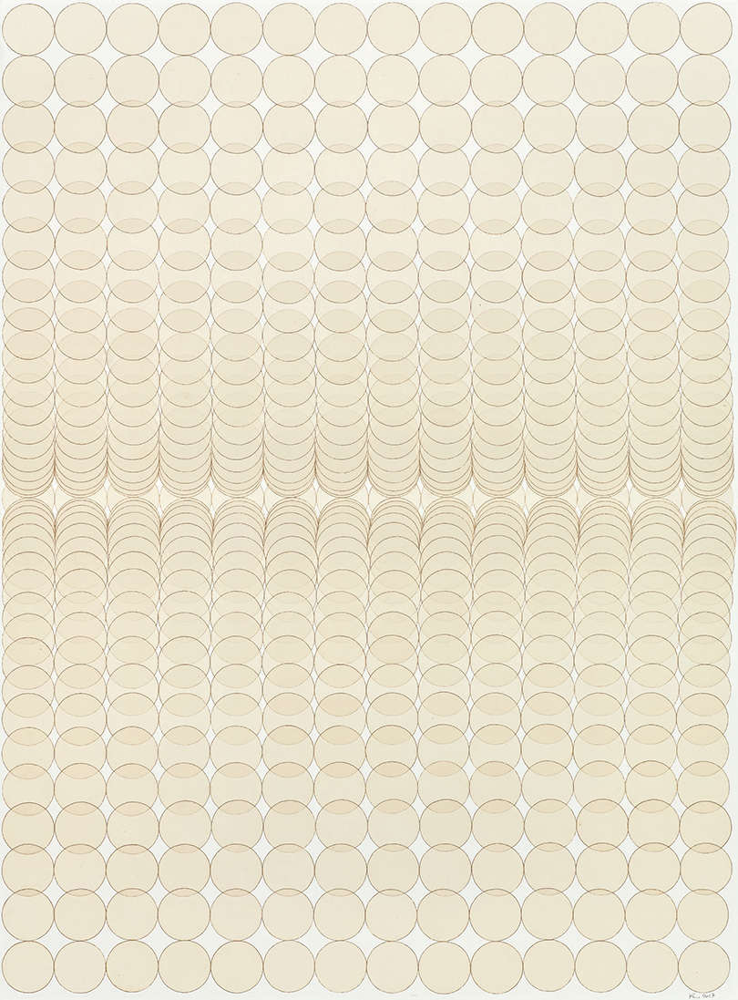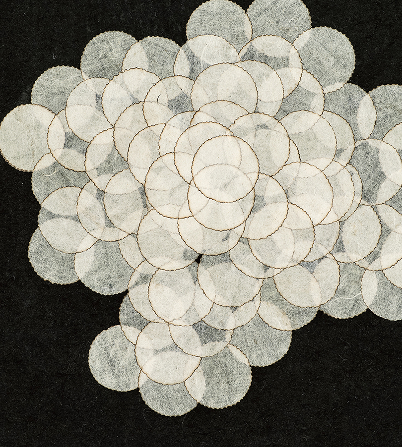 엔리코 룽기 <위상(Phasing)>에서는 작품에 쓰인 한지의 첫 장에 서예적인 몸짓이 가해지는데, 이는 절제가 이뤄지면서도 다시 만들어낼 수 없는 몸짓이다. 먹이 시원하게 뿜어지는 형태를 자주 취하기 때문에 더욱 그렇게 보인다. 두 번째 장에는 첫 장의 윤곽에 따라 향을 사용해 먹의 흔적에 대응하는 부분을 잘라낸다. 이러한 표면은 어느 정도는 첫 장의 음화(negative)로 기능하며, 보다 정확히 말하면 자신을 보충하는 동시에 스스로와 대비되는 것을 드러낸다. 이것은 서구인들이 일반적으로 음양의 법칙과 연관지어 동양의 전체론적 접근으로 해석하는 개념이라 하겠다. 다른 작품에서 작가는 몸짓을 활용한 표현 대신 검은 한지를 완벽한 원형으로 잘라낸 모양을 성좌와 같이 배열한다. 작품을 만드는 과정은 동일하다. 원형의 구성을 두 번째 한지로 옮긴 뒤 향을 사용해 구멍을 낸다. 작가는 형태가 겹치는 곳을 그대로 둠으로써 서로 맞물린 원형의 무늬가 곱게 이어진 형상을 얻어낸다. 두 장의 한지는 살짝 어긋나있어 쾌활한 리듬을 만들어내며, 작가가 처음에 만든 구성의 흔적을 좇으며 이것을 자유롭게 그려내기에 리듬적 요소가 배가된다. 나는 이를 ‘음악적’이라 칭하기를 제안한다.