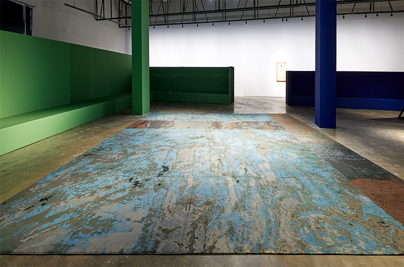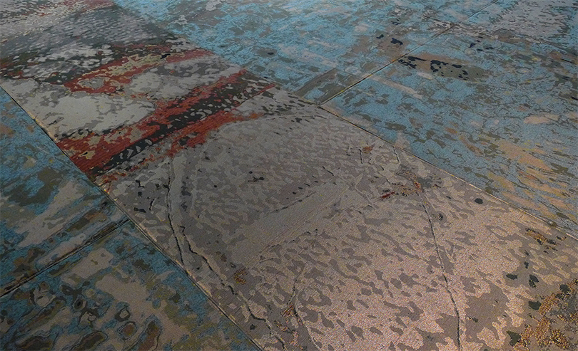 <프라미스 파크 인 광주>는 가로 세로 7m 60cm의 거대한 정사각형 모양에 1.5cm의 두툼한 두께를 지닌 카펫 형식의 작품이다. 별다른 안내 문구가 없다면, 누군가는 바닥에 깔린 이 작품을 쉽게 지나쳤을 것이다. 카펫의 사방을 천천히 돌며 살피자, 씨줄과 날실이 엮이는 ’직조’가 남긴 특유의 촉감적 질감과 암호와도 같은 패턴들이 조명 각도와 보는 방향에 따라 다채로운 모습을 드러낸다. 군청색과 갈색, 올리브진흙색 등의 비균질적 조합과 위에서 바닥을 내려다보는 조감의 시선 때문에, 작품은 흡사 위성 지도나 군대에서 주로 사용하는 위장용 패턴 혹은 추상 회화의 한 부분을 확대해 보는 느낌을 전한다. 그렇다면, 이 작품의 제목이 지시하는 ‘공원’은 무엇이며, 광주라는 특정 도시와 공원의 어떤 이야기를 담고 있는 것일까?