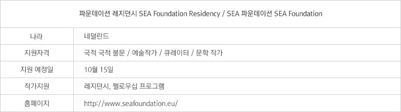 네덜란드의 SEA 파운데이션은 현대미술이 유연성을 갖춰야 하지만 이에 못지않게 지속성도 중요하다고 강조한다. 예술 작가뿐만 아니라 큐레이터, 문학 작가, 연구원, 비평가에게까지 이 레지던시의 문은 활짝 열려있다. 일여 년 동안 참여하게 되는 이 레지던시는 큐레이팅, 예술 비평, 예술 철학, 리서치, 조각, 미디어아트, 음악, 문학, 텍스타일, 그래픽 디자인, 건축, 드로잉과 회화 등 여러 방면에서 활동하는 사람들 모두를 환영한다. 현대미술 창작을 돕고, 예술 이론을 발전시키는 데 초점을 맞추기 때문이다. 또한, 지역을 넘어 세계적 맥락에서의 예술과 예술 활동에 관한 다양한 담론을 제시하고, 선정된 작가들의 상호작용을 통해 더 광범위한 네트워크를 형성할 수 있도록 돕는 등 작가뿐만 아니라 예술 생태계 전반에 긍정적인 영향력을 행사하고 있다.