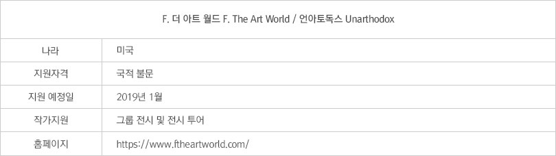파인아트, 사진, 디지털 아트 등을 하는 작가들이라면 주목해야 할 프로그램이다. 뉴욕에서 열리는 그룹전에 참여할 수 있는 기회를 얻을 수 있기 때문! 재치 있는 이름의 ‘F. 더 아트 월드’가 그 주인공이다. 욕설을 연상하게끔 하는 알파벳을 사용해, 이 대회가 어떠한 지향점을 가졌는지를 단번에 알 수 있기 때문이다. 실제 이들의 홈페이지를 방문하면, 빨간색 대문자로 ‘전통과 관습, 종교와 정치의 반항적인 작업, 그리고 이에 대해 작가만의 시각적 표현법을 공유하자’고 쓰여 있다. 심지어 이 대회는 아마추어, 전문가 등의 경계도 나누지 않으니 정말 그 누구라도 지원할 수 있다.