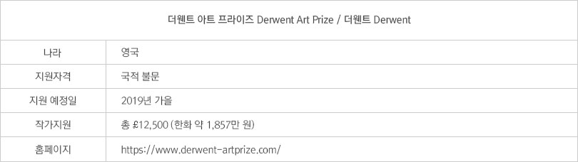 더웬트 아트 프라이즈는 2년에 한 번씩 공모를 연다. 이번에 소개되는 아티스트 지원 프로그램 가운데 거의 유일하게 평면 예술에 집중하는 공모이기도 하다. 총상금은 £12,500(한화 약 1,857만원)인데, 이중 대상 수상자에게 £6,000(한화 약 889만 원)를, 2등 수상자에게는 £3,000(한화 약 444만 원), 3등 수상자에겐 £1,500(한화 약 222만 원)를 차등 분배한다. 또 영 아티스트 어워드로 25세 이하 젊은 작가에게 £750(한화 약 111만 원)를 수여하며, 대중의 투표를 통해 선정된 작가에게는 피플스 초이스 어워드로 상금 £750를 준다. 또한, 수상 작가들은 런던의 몰 갤러리즈(Mall Galleries)에서 전시를 갖는데, 2018년도에 선정된 작가들은 오는 9월 18일부터 23일까지 약 5일간 몰 갤러리즈에서 전시를 연 후 영국의 여러 곳을 순회할 예정이다. 더웬트 아트 프라이즈는 평면예술 가운데서도 연필, 색연필, 차콜, 그리고 흑연 등을 사용한 드로잉 작업을 하는 작가들에게 특히 주목한다. 따라서 조금 더 혁신적인 드로잉 방법론을 갖고 있는 작가들이 유리하다고 볼 수 있다. 테크닉적인 면도 큰 비중을 차지한다. 지난 2016년도에는 이탈리아 출신 작가인 아짐 술라이(Agim Sulaj), 영국 출신의 리 와그스태프(Lee Wagstaff)와 팀 라이트(Tim Wright), 홍콩 출신의 애플-웡후이펑(Apple Wong Hui Fung)이 선정되었다. 술라이는 사실적, 해학적인 묘사로 초현실주의적인 작품을 선보이는 작가다. 한편 팀 라이트는 초상화 작업으로 대표된다. 원래 그는 유화로 작업하지만, 공모에는 드로잉 작업으로 응모했다. 라이트는 “이 프로젝트는 드로잉이라는 매체의 힘과 그 중요성을 알리는 플랫폼으로 오직 드로잉을 위한 것이다. 예술 작품으로서 펜슬 드로잉 고유의 권리를 선보일 수 있는 자리다”라는 ‘팁’을 전하기도 했다. 올해 쇼트리스트에 이름을 올린 한국인 작가 정성훈의 이름도 반갑다. 올해 공모는 이미 종료됐지만, 2020년 지원 공고가 내년 가을쯤에 열릴 예정이니 꾸준히 홈페이지를 확인해보도록 하자.