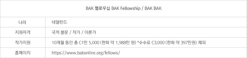 BAK는 총 C12,000(한화 약 1,591만 원)를 10개월에 걸쳐 지원한다. 우선 6주마다 있는 펠로우십 미팅에 참여하는 유럽권 펠로우 4명의 여행경비를 지원한다. 또 다른 다섯 자리는 네덜란드를 기반으로 활동하는 펠로우를 위한 것이며 정치적·경제적인 차이로 인해 거주 지원이 필요한 지원자를 위해 모든 것을 지원하는 레지던시가 딱 한 자리 있다.