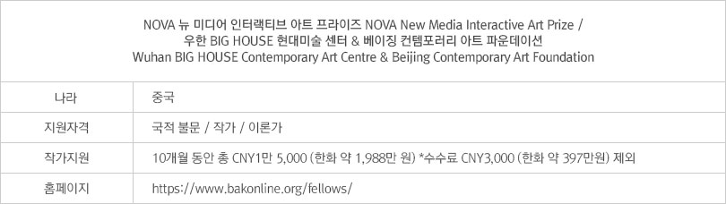 2018년 처음으로 야심 차게 출발한 NOVA 뉴미디어 인터랙티브 아트 프라이즈는 우한의 BIG HOUSE 현대미술 센터와 베이징 컨템포러리 아트 파운데이션이 협력해 운영한다. 젊은 작가들의 사기를 북돋고 특히 예술과 테크놀로지의 경계를 허무는 데 일조하겠다는 포부를 밝힌바 있는 이 수상 프로그램은 예술과 테크놀로지의 결합에 대해 새로운 규율들을 재정비하기 위해 매년 새로운 작가를 발굴하려는 계획을 세웠다.